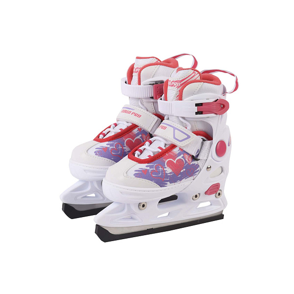 Изящные коньки в белом цвете с розовыми элементами и принтом в виде сердечек идеально подойдут для юных любителей зимнего спорта. Комфортные, устойчивые коньки предназначены для любительского катания на открытом воздухе и крытых катках. Раздвижная конструкция с кнопочным фиксатором позволяет легко и быстро регулировать размер в пределах 29-32. Можно подобрать оптимальный размер для растущего ребенка. Коньки просты и удобны в использовании, поэтому ребенок с легкостью сможет надевать и снимать их.
