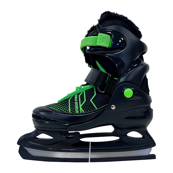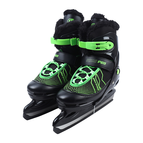 Раздвижные коньки Rollo Pro черного цвета имеют высокий голенище с мягкой меховой подкладкой. В конструкции предусмотрена возможность регулировки размера – четыре размера в одном. Надежная фиксация выполняется с помощью липучки, шнурков и пластикового ремешка. Коньки легко регулируются путем нажатия на кнопку, что позволяет быстро изменять длину и подгонять под нужный размер. Такие коньки подходят для начинающих и продолжающих кататься детей.