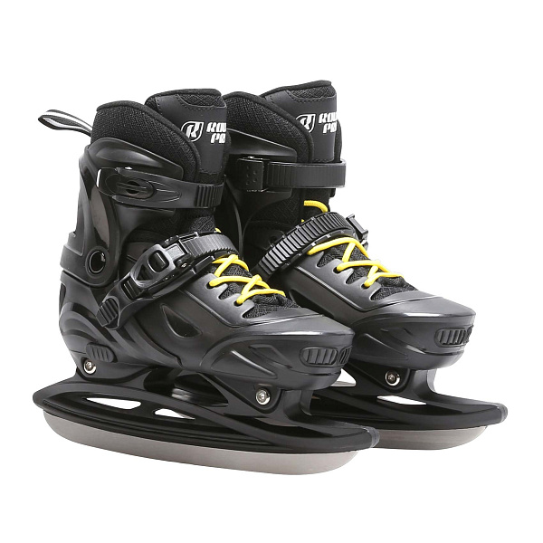 Коньки Rollo Pro выполнены в черном цвете с яркими желтыми шнурками. В конструкцию входят механизмы для надежной фиксации: липучка, шнурки и пластиковый фиксатор. Размер регулируется путем нажатия на кнопку, что позволяет использовать коньки при росте размера ноги ребенка. Модель подходит для начинающих и опытных любителей зимнего катания.