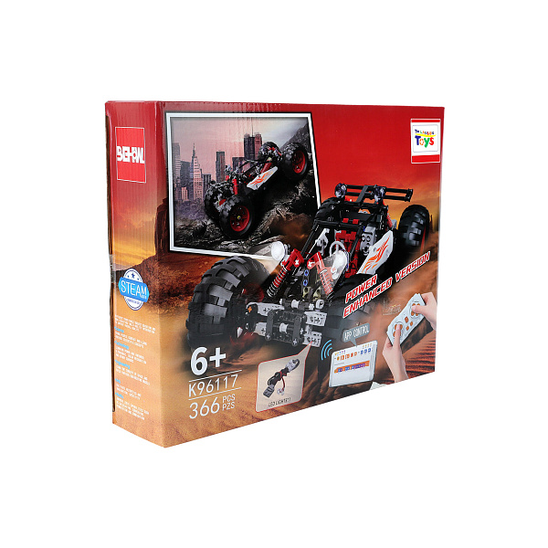 Модель багги относится к категории развивающих блочных конструкторов. В набор входят 366 пластмассовых деталей, пуль дистанционного управления и аккумулятор.