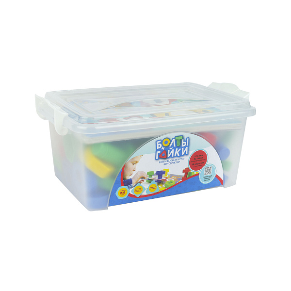 Необычный тематический конструктор разработан для детей от 2 до 6 лет. В набор входят 32 болта и аналогичное количество гаек, 16 красочных карточек с заданиями и удобный контейнер с крышкой. Крепежные элементы оформлены в ярких цветах, поэтому надолго займут внимание дошкольников.