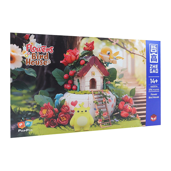 Конструктор «Дом для птиц и Медвежонок» представляет собой набор из 696 деталей, из которых можно собрать декоративный домик с элементами природы и милой фигуркой медвежонка. Модель оформлена в нежных спокойных тонах с проработкой натуральных деталей — цветов, листьев и деревянных элементов. Особое внимание уделено деталям крыши, дверцы и элементов оформления, что придаёт сборке выразительность и оригинальность.