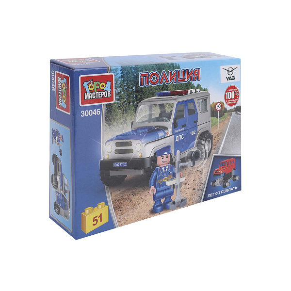 Тематический конструктор заинтересует ребенка старше 4 лет, надолго завладеет его вниманием. Из 51 детали юный любитель техники сможет собрать УАЗ «Хантер» на рифленых колесах. Справиться с задачей без помощи взрослых позволит подробная инструкция.
