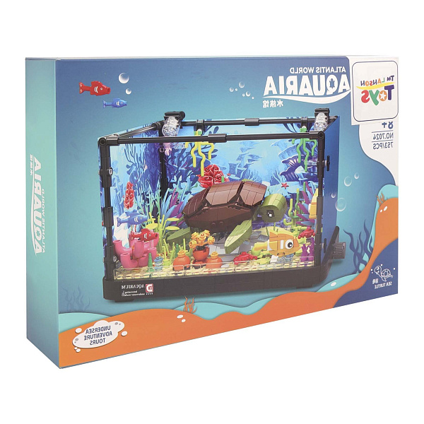 Конструктор «Аквариум с черепахой» состоит из 753 деталей и предлагает создать интерактивный подводный мир. Световые эффекты в модели добавляют реалистичности и зрелищности, подсвечивая водные элементы.