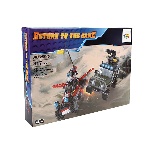 Ребенку старше 6 лет доставит удовольствие самостоятельная сборка тематического конструктора. В набор входят 317 деталей. Подробная инструкция позволит ребенку смастерить два военных автомобиля с разными конструктивными особенностями. Блоки надежно соединяются друг с другом, благодаря чему конструкции прочные и не распадаются. Подобные развлечения необходимы для гармоничного развития детей. Они учат концентрировать внимание, стимулируют аналитические способности и моторные функции. Дошкольник станет аккуратным, усидчивым и дисциплинированным. Для производства элементов применяется пластик.