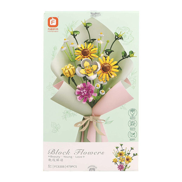 Конструктор «Букет с подсолнухами с подсветкой» включает 439 деталей, позволяющих создать красивую цветочную композицию. В комплект входят элементы для сборки ярких подсолнухов, ромашек и других цветов, украшенных светодиодной подсветкой. Готовый букет выглядит реалистично благодаря мелким деталям и качественным материалам.
