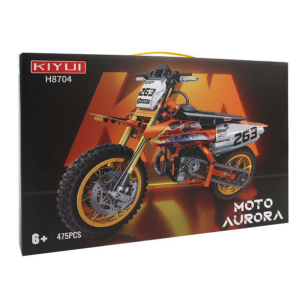 Конструктор «Мотоцикл для спидвея H8704» состоит из 475 деталей и представляет собой реалистичную модель гоночного мотоцикла, выполненную из прочного пластика. Мотоцикл выполнен в ярких оранжевых и чёрных оттенках с деталями в виде номеров и графических элементов, что придаёт модели динамичный и спортивный вид. Проработаны такие элементы, как рельефные покрышки, передние амортизаторы, двигатель и тормозная система, обеспечивая высокую степень реалистичности.