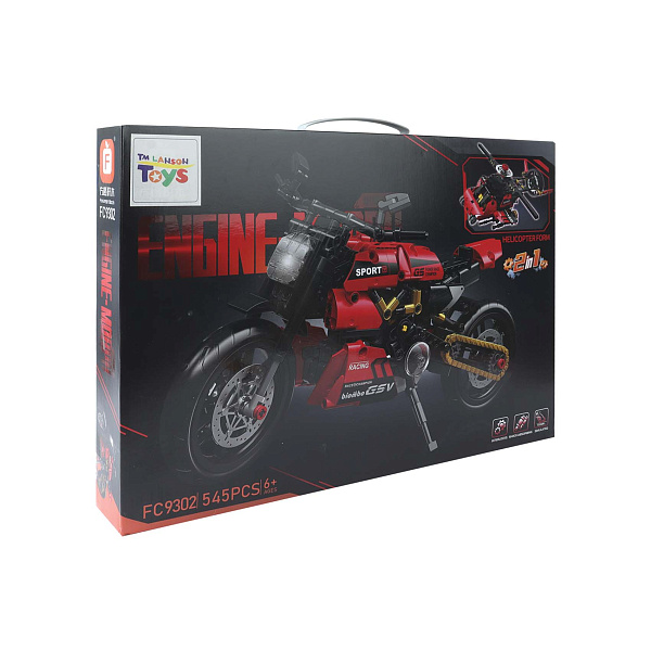 С набором конструктора у ребенка появится сразу две фигурки – вертолет и мотоцикл, менять которые несложно с помощью перестройки деталей. Всего в наборе 545 деталей. Собранные модели отлично детализированы, выполнены в черно-красных цветах, которые подчеркивают динамичный и технологичный дизайн. Внешний вид транспорта приближен к реальному мотоциклу – он оснащен рулем с амортизацией, цепной передачей и передними подвесками.