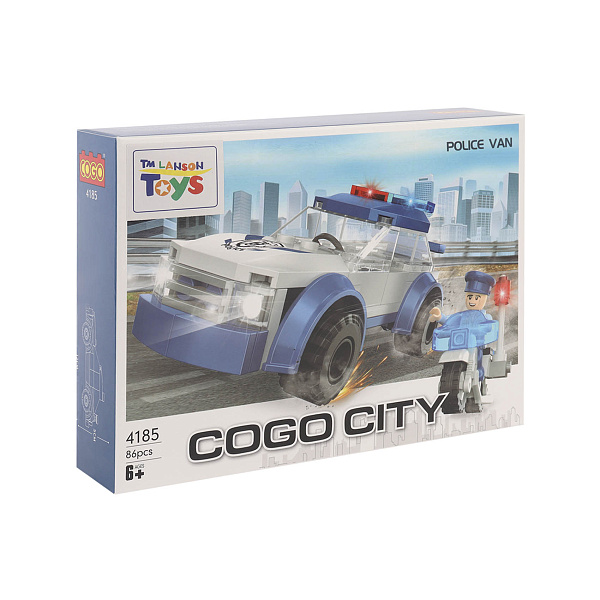Конструктор содержит 86 деталей, из которых собирается полицейский автомобиль, человечек и мотоцикл с мигалкой.