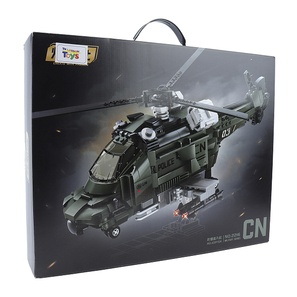 Конструктор «Полицейский вертолет» состоит из 832 деталей. Из них можно собрать вертолет с подвижными лопастями и открывающейся кабиной пилота. У модели есть ракеты и различные оружейные элементы, которые крепятся к корпусу. После сборки вертолет можно поставить на специальную подставку, чтобы его было удобно храниться на полке.