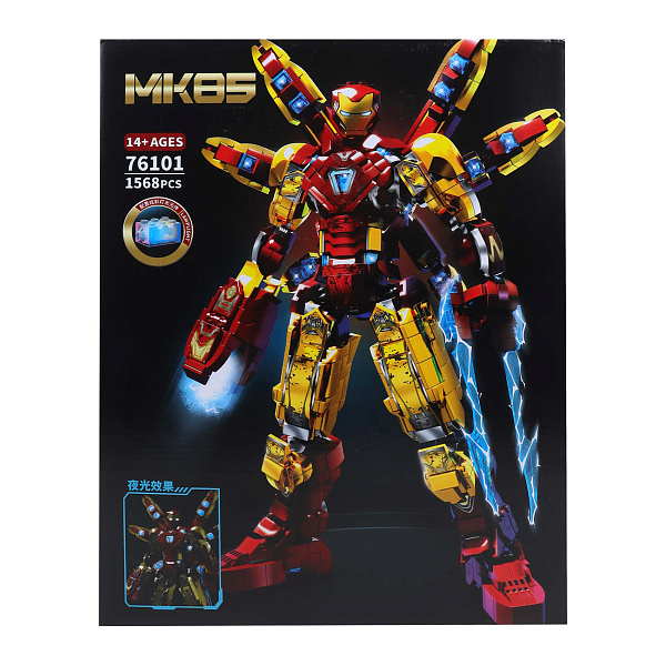 Конструктор Робот МК85 высотой 38,5 см представляет собой детализированную модель боевого робота в стиле супергероя, выполненную из 1568 пластиковых элементов. Готовая сборка демонстрирует мощную позу с подсветкой на груди и конечностях, что придаёт фигуре динамичный и технологичный вид.