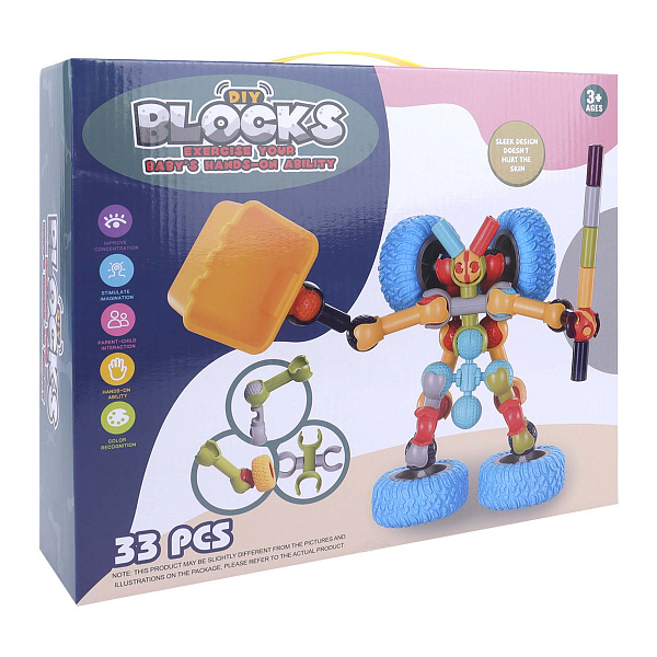 Конструктор многовариантный с подвижными соединениями идеально подходит для детей старше 3 лет. В комплекте 33 детали различной формы и размера, из которых можно создавать бесчисленное количество фигур. Детали конструктора изготовлены из качественного пластика и окрашены в яркие цвета, что способствует развитию цветового восприятия и мелкой моторики.