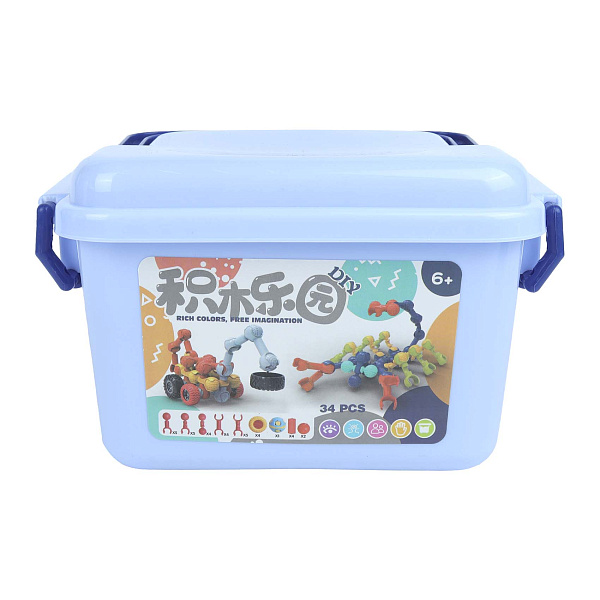 Конструктор с подвижными соединениями в ящике включает 34 детали из безопасного пластика. В комплекте множество цветных элементов: шарниры, крепления, колеса. Такое разнообразие позволяет создать самые разные игрушки, например машинки, роботы и фантастические существа.