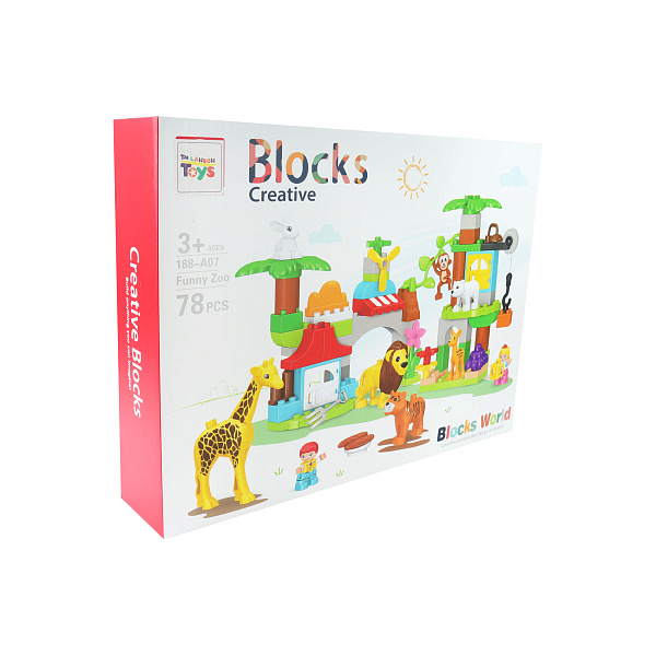 В набор входит 78 разноцветных деталей из прочного пластика. Ребёнок сможет создавать сооружения, деревья, цветы и наполнять зоопарк животными. Детали конструктора блочного типа, поэтому просто скрепляются между собой и так же просто разбираются.