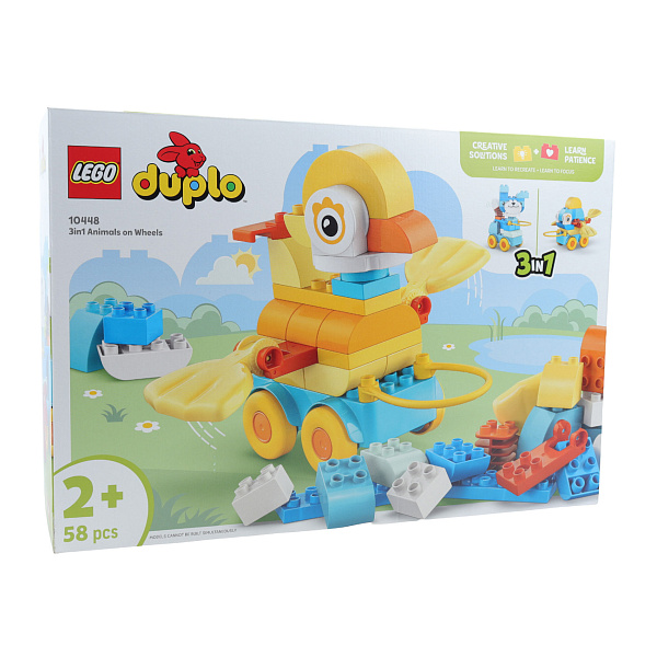 Конструктор LEGO DUPLO Животные на колесах, 3 в 1 включает 58 деталей и подходит для детей от 2 лет. Игрушка позволяет собрать трех разных животных: утку, рыбу и собаку. Каждое животное имеет колесную базу, благодаря чему их можно катать по полу. В конструкции присутствуют вращающиеся и подвижные элементы, например, крылья, плавники и шея, которые легко двигаются и развивают мелкую моторику.