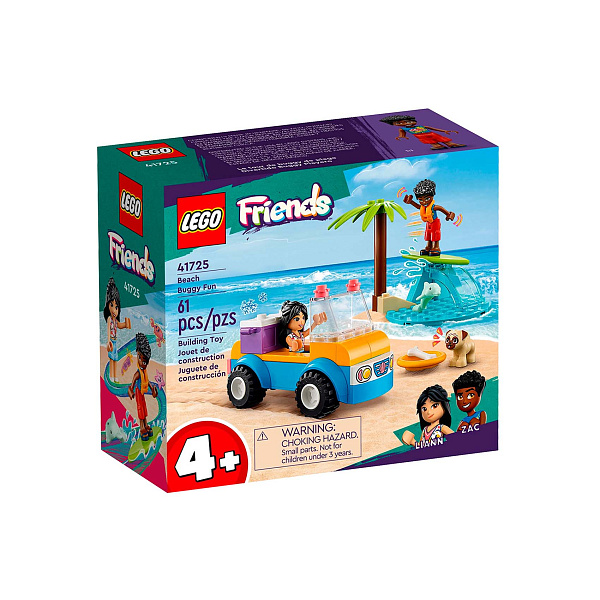 Дети в возрасте от 4 лет и старше, которые любят играть на пляже, могут создавать истории с набором LEGO® Friends Beach Buggy Fun. Набор помогает детям научиться строить, пока они занимаются творчеством с персонажами Лианн и Заком. Аксессуары включают холодильник для еды с бананом и мороженым. В набор также входят игрушечный пляжный багги и волна, а также мопс и дельфин.