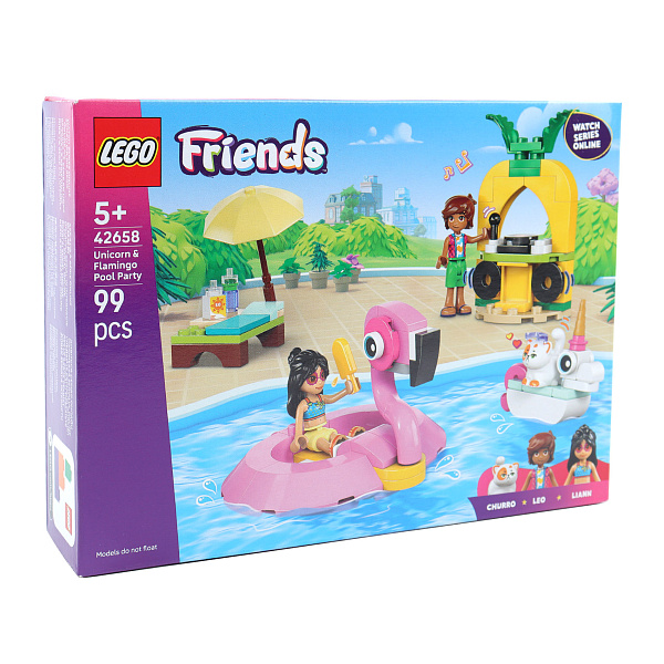 Конструктор LEGO Friends «Вечеринка у бассейна с единорогом и фламинго» включает 99 деталей и рассчитан на детей старше 5 лет. В набор входят две мини-куколки Лео и Лианн, фигурка кота Чурро, а также аксессуары для игры, например, солнцезащитный крем, фруктовое мороженое, напиток и микрофон. Есть шезлонг с зонтиком и диджейский пульт, что добавляет разнообразия игровому процессу.