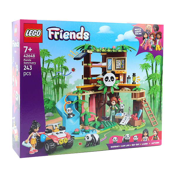 Конструктор LEGO Friends «Уход за животными в заповеднике панд» включает 243 детали для сборки домика на дереве и квадроцикла. В комплекте две мини-куколки и три фигурки панд. Игровая площадка украшена слайдами, лестницей и различными аксессуарами, такими как весы, щетка, лопата, солнечная панель и фонарь. Конструктор подходит для детей от 7 лет и старше.