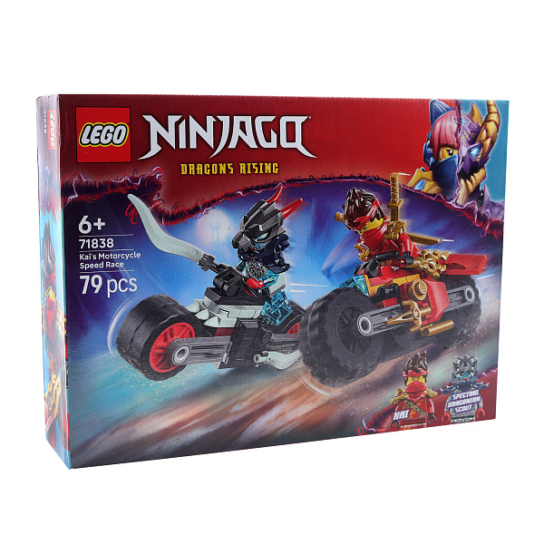 Конструктор LEGO Ninjago «Гонка Кая на скоростном мотоцикле» состоит из 79 деталей. В набор входят два мотоцикла с подвижными колесами: гоночный байк Кая с двумя кинжалами и демонический мотоцикл Спектрального Дракона. В комплект входят две фигурки — Кай с полупрозрачным лезвием и два золотых меча-катаны, а также спектральный дракон-разведчик с мечом.