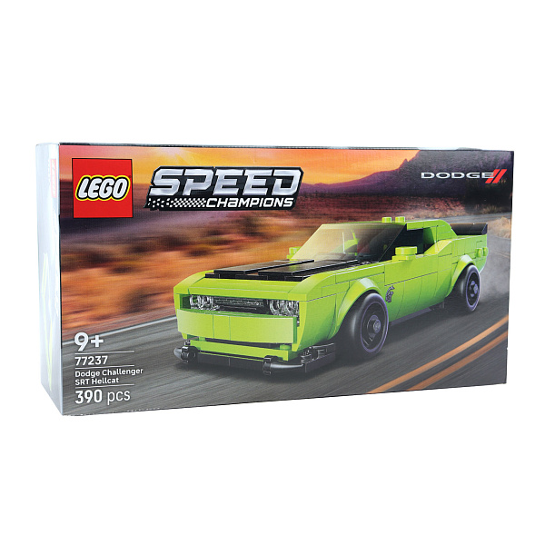 Конструктор LEGO Speed Champions представляет модель спортивного автомобиля Dodge Challenger SRT Hellcat. В наборе 390 деталей, из которых собирается детализированный маслкар с длинным капотом, воздухозаборником, мощной решеткой радиатора и двойными выхлопными трубами. Машина выполнена в ярком зеленом цвете с черными элементами. Для игры в комплект входит минифигурка водителя в костюме Dodge.