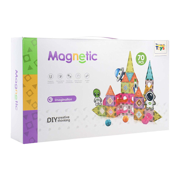 Магнитный конструктор «Космодром с горками» состоит из 70 ярких деталей различных форм и размеров. В набор входят треугольники различных цветов, квадратные элементы с отверстиями, а также различные соединительные детали и специальные элементы для горок. Для игры есть шарики, которыми можно запускать по созданным конструкциям. Дополнительно входят фигурки — космонавта, инопланетянина, ракеты и летающей тарелки.