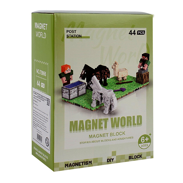 Конструктор магнитный «Magnet World» состоит из фигурок и элементов, выполненных в стиле пиксельной графики. В комплект входят фигурки двух персонажей — Стива и Алекса, а также четыре фигурки животных: коричневая лошадь, белая лошадь с пятнами, бежевая лама и небольшой коричневый куб. Все элементы размещаются на зеленой пластиковой платформе с изображением травы и мшистых блоков.
