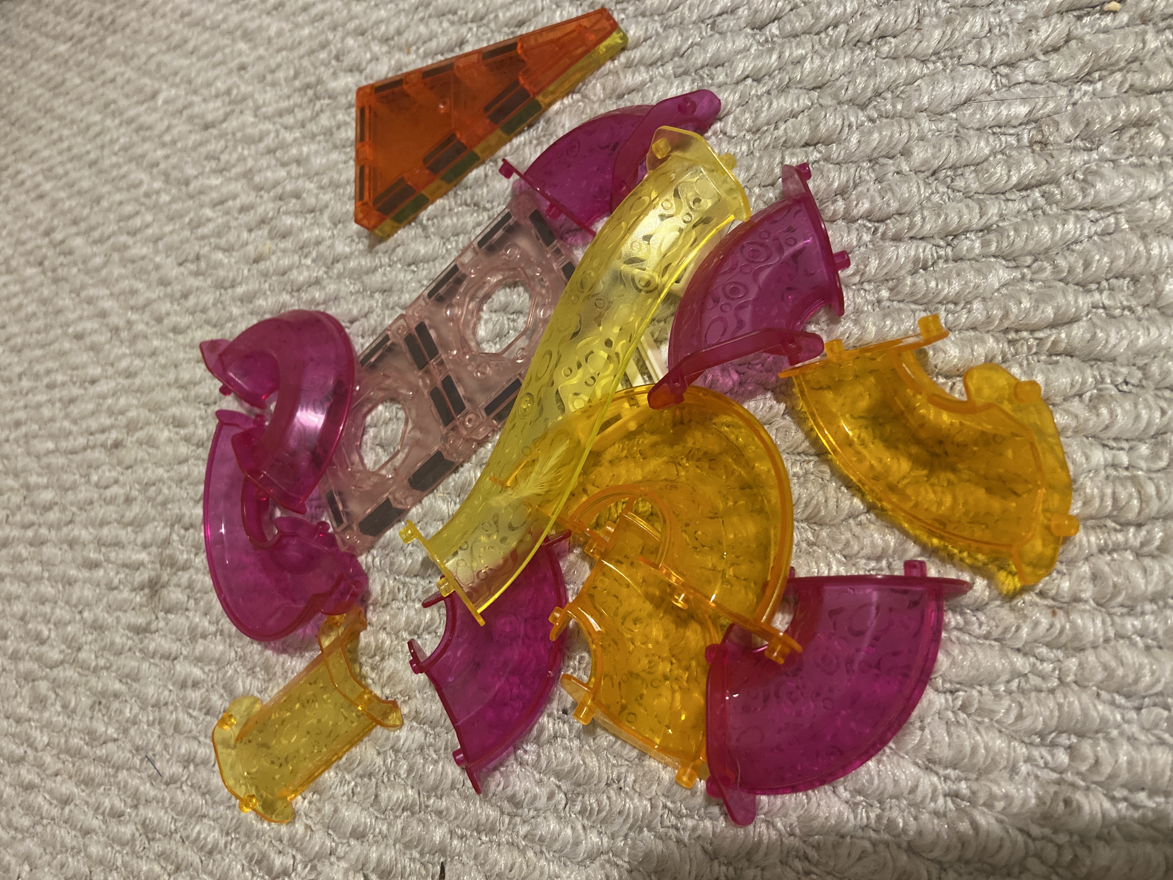Детали выполнены из прочного пластика с магнитными вставками, позволяющими легко и прочно соединять элементы между собой. Это дает возможность строить объемные конструкции с башнями и трассами для шариков. Горки создают динамические маршруты, заставляя шарики скатываться с разных уровней. Конструктор развивает логику, моторику и воображение, помогает экспериментировать с формами и движением.