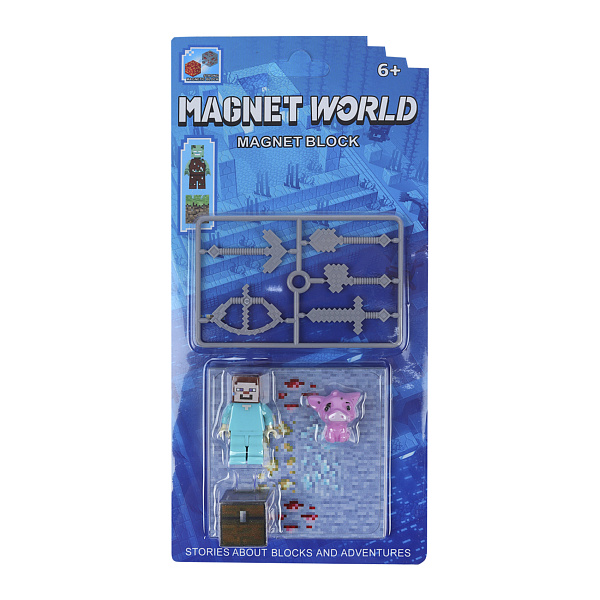 Все детали выполнены из прочного пластика с встроенными магнитами — легко соединяются между собой, позволяя собирать сцены, приключения и мини-истории. Идеально подходит для развития пространственного мышления, воображения и навыков конструирования. Сюжет с жителем, свинкой и сундуком добавляет игре увлекательность — можно придумывать истории о поисках сокровищ, фермерской жизни или путешествиях.