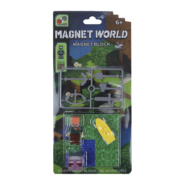 В наборе есть фигурка персонажа, скейтборд, кубик, пять видов оружия. Магнитные элементы легко соединяются друг с другом. Размер каждого кубика составляет 2×2×2 см. Набор подходит для детей старше шести лет.