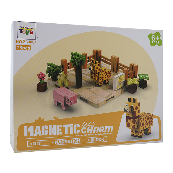 Магнитный конструктор «Зоопарк» включает 78 деталей. В наборе загон для животных, две фигурки зверей, растения и табличка с названием животных. Детали соединяются с помощью магнитов. Конструктор собирается быстро. Фигурки можно менять местами или ставить рядом с другими элементами. Игра с ним помогает развивать воображение.