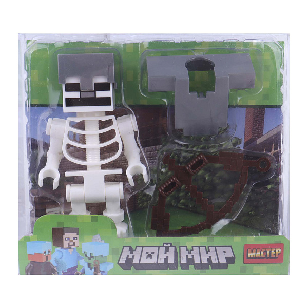 Конструктор «Мой мир» погружает в увлекательный мир приключений. В комплект входит фигурка Скелета из популярной игры размером 8 см. Персонаж изготовлен из прочного пластика белого цвета и имеет подвижные руки, что позволяет ему держать оружие.
