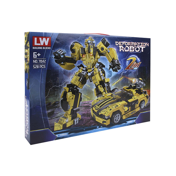 Конструктор трансформируется из робота в автомобиль. Желтый цвет деталей можно дополнить любыми наклейками, целый лист которых идет в наборе. Все детальки выполнены из прочного и ударостойкого пластика.