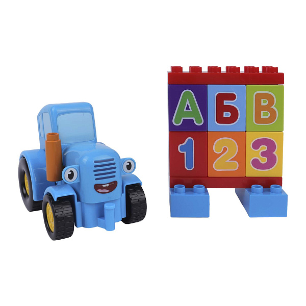 Основные элементы конструктора — яркие пластиковые кубики с буквами и цифрами, что способствует развитию навыков чтения и счета. Центральный элемент набора — синий трактор, который привлекает внимание и вызывает улыбку.