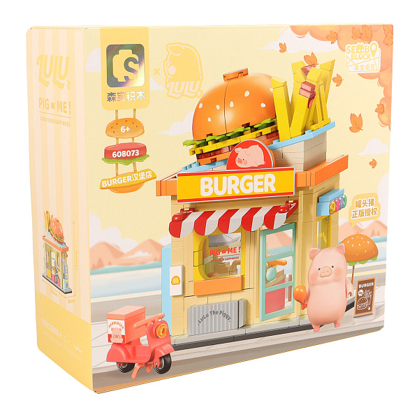 Сюжетный набор включает в себя элементы бургерной: огромный бургер на крыше, картошка фри и красочные вывески. Эта конструкция погружает в атмосферу уличной еды и радости. Миниатюрная фигурка свинки Лулу добавляет набору особый шарм, делая его идеальным для игры и коллекционирования.