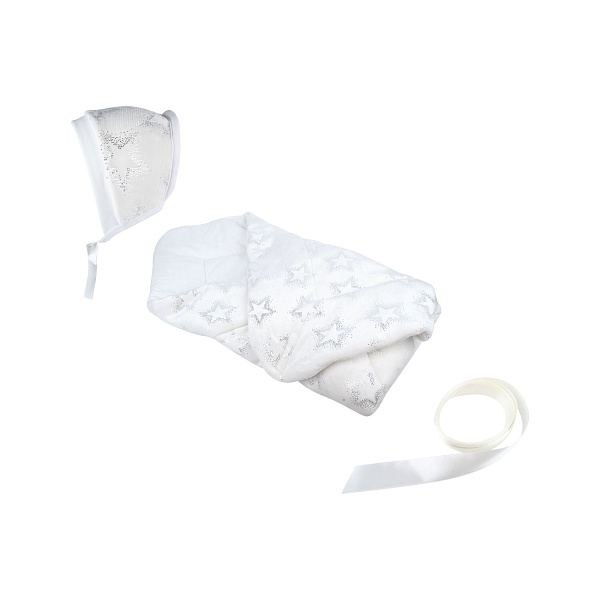 Конверт и чепчик в комплекте предназначены для встречи малыша из родильного дома. Изделия призваны обеспечить комфорт ребенку, оформлены в спокойной цветовой гамме. В качестве украшения применяются сверкающие элементы, формирующие узор в форме звезд. Удобная застежка липучка упрощает фиксацию края. В развернутом виде приспособление успешно справится с функцией одеяла.