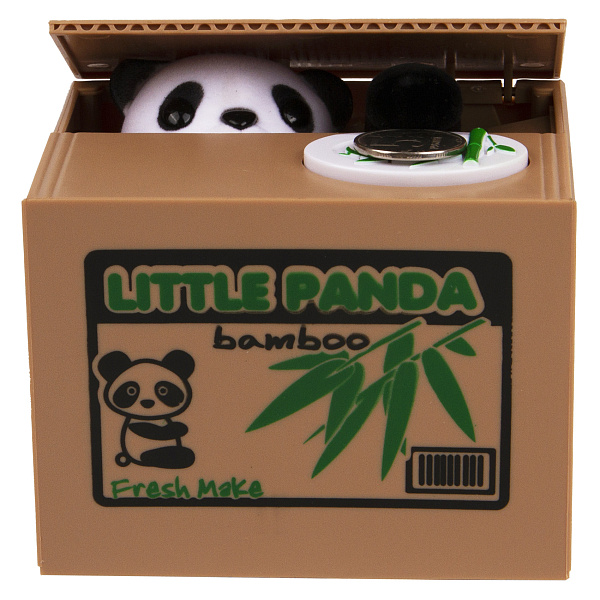 Копилка-сейф на батарейках поможет развлечь детей и взрослых, а также накопить достаточно быстро определенную сумму денег. Забавный воришка панда будет ловко таскать монетки, положенные на тарелочку. Игрушка экономно расходует энергию, поэтому комплекта батарее хватит надолго. При производстве не применяются вредные компоненты, что позволяет использовать изделие детям старше трех лет. Взаимодействие с ловким пандой, который прячется внутри коробки, позволит развить логическое мышление, ловкость рук, память и мелкую моторику. Оригинальный подарок подходит не только детям любого возраста, но и взрослым.