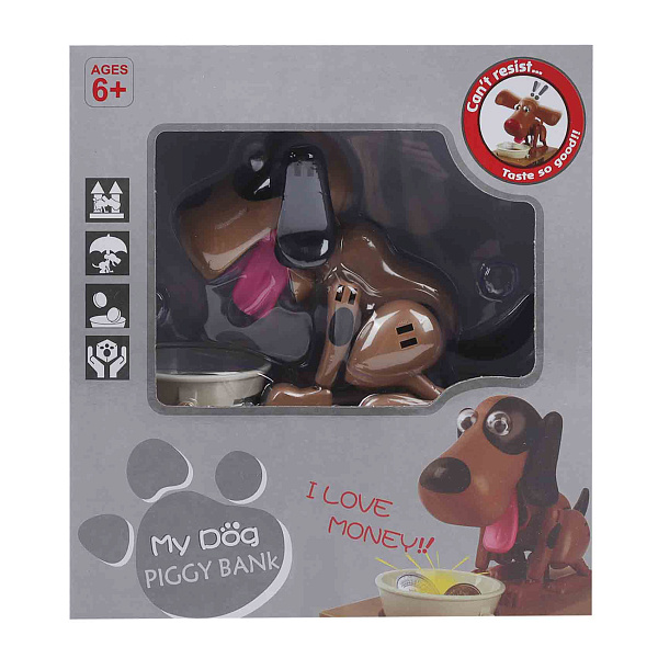 Копилка выполнена из прочного пластика, стилизована под собачку с выразительными глазами и розовым язычком. У собачки есть миска, в которую нужно класть монетки — при этом собачка интерактивно реагирует на внесенные деньги. Устройство работает на двух батарейках типа AA (в комплект не входят).