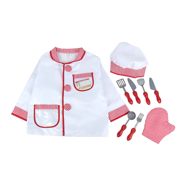 Игровой костюм повара – идеальный набор для маленьких кулинаров от 3 лет. В комплект входит белый поварской китель с красной окантовкой и клетчатыми элементами, колпак, рукавичка и набор игрушечных кухонных инструментов.