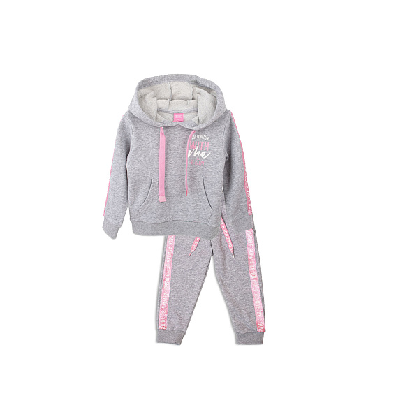 Серый меланжевый костюм с розовыми элементами чудесно подойдет для занятий спортом. Комфортный комплект состоит из толстовки и брюк. Толстовка с длинным рукавом и капюшоном с завязками украшена небольшим печатным рисунком спереди. Также выполнен накладной карман типа «кенгуру». На рукавах декоративные продольные розовые полоски с белыми надписями.