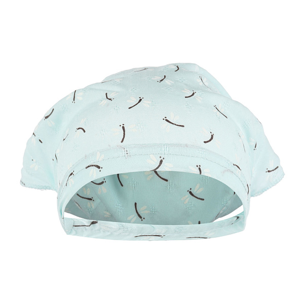 Материал, из которого выполнено изделие, не содержит никакой синтетики, его состав на 100% хлопковый. В такой косынке ребенку комфортно и приятно. В песочнице во дворе, на пляже, на даче или на прогулке в парке косынка будет весьма полезным головным убором в летнюю жару. Цвет изделия – голубой, декор – мелкий черный принт в виде червячков.