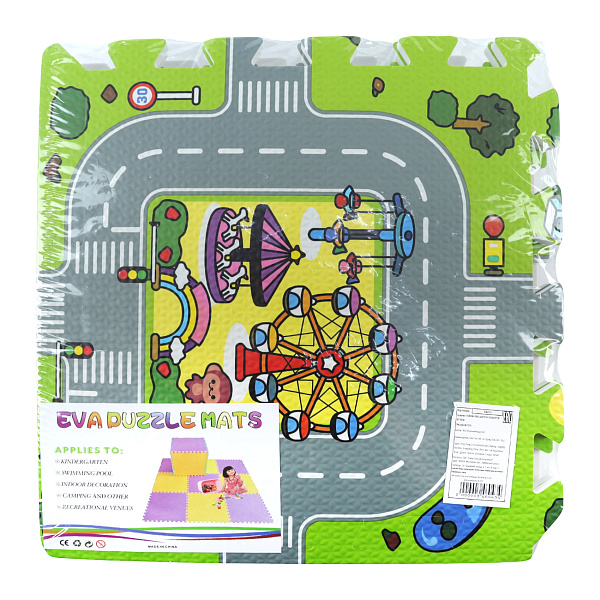 Коврик-пазл «Дорога», 9 элементов, размер каждого 30×30 см — яркий и игровой коврик, состоящий из девяти элементов-пазлов, которые легко соединяются между собой. Поверхность украшена красочным изображением дороги с разметкой, домиками, парком и другими деталями городского пейзажа, что стимулирует игру с машинками и развитие воображения у детей.
