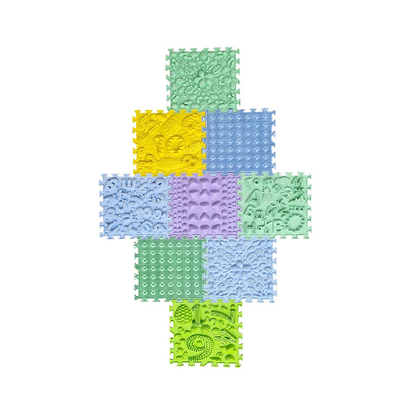 Детский игровой модульный коврик-пазл познакомит ребенка с новыми тактильными ощущениями. Модульный коврик проводит точечный массаж рефлекторных зон стопы, способствует профилактике плоскостопия и образования мозолей. Игры на коврике также уменьшают отечность и снимает усталость с ног. Работая с ковриком, малыш узнает, какая на ощупь трава, зефир, ежик или крокодил. Коврик изготовлен из прочного и гипоаллергенного ПВХ. Всего в наборе 9 модулей, которые соединяются между собой. Размел модуля: 25х25см.
