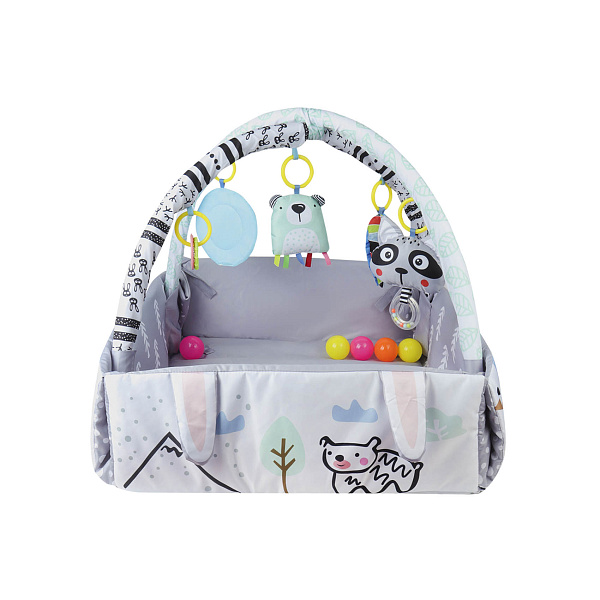 Развивающий коврик выделяется из линейки аналогичной продукции нестандартным дизайном. Он оснащен бортиками, дугами, ортопедической подушкой. Для развлечения крохи предусмотрены подвесные элементы и шарики в количестве 20 штук. При необходимости борта можно опустить или поднять.
