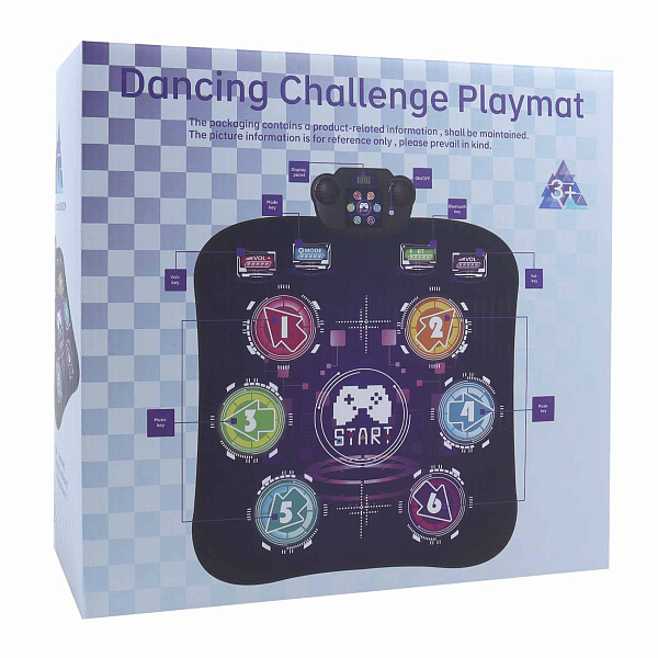 Коврик танцевальный - это интерактивная игрушка для детей от 3 лет, которая превращает обычную комнату в настоящий танцпол и способствует развитию координации, чувства ритма и общей физической активности. Изделие выполнено из прочного текстильного материала темно-фиолетового цвета. На его поверхности расположены шесть крупных сенсорных зон, обозначенных цифрами от 1 до 6 и оформленных в яркие разноцветные круги. В центре коврика - кнопка «START» с изображением геймпада. В комплект входит пластиковый блок управления с небольшим дисплеем, двумя встроенными динамиками и функциональными кнопками для выбора режимов, регулировки громкости, включения Bluetooth и включения питания.