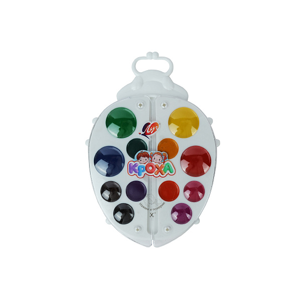 Акварельные краски 12 цветов помещены в футляр в форме божьей коровки с прозрачной крышкой. Они станут отличным подарком любому ребенку старше 3 лет. Акварель легко растворяется водой, мягко ложится на бумагу, позволяет получать мазки разной интенсивности.