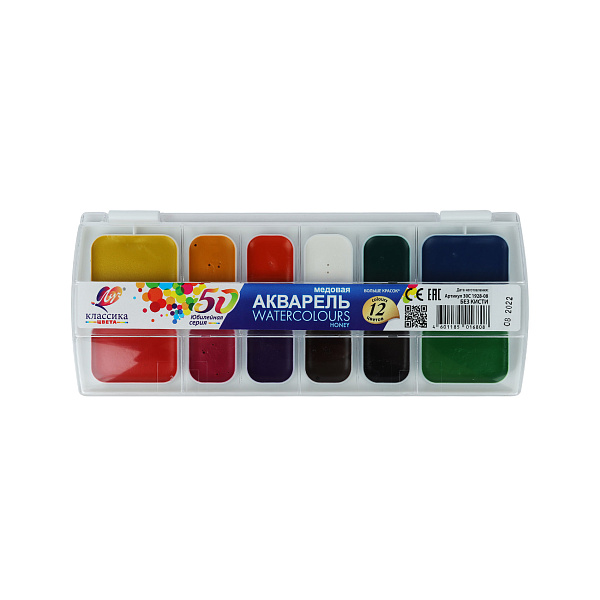 Акварельные краски из юбилейной серии предназначены для детей старше 3 лет. Набор состоит из 12 цветов, объем самых востребованных увеличен. Медовая акварель быстро сохнет, хорошо смешивается, легко растворяется водой. Она не имеет резкого запаха, без труда смывается с рук.