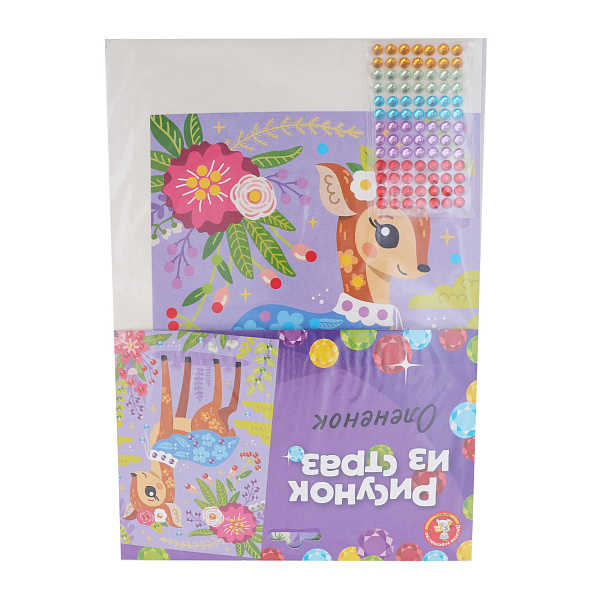 - В комплекте: картонная основа с рисунком, 91 самоклеящийся страз пяти цветов.