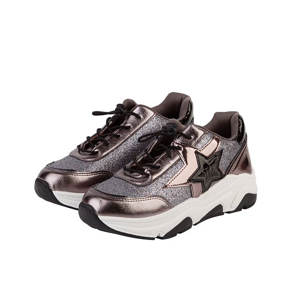 Модные кроссовки для девочек школьного возраста полны блеска и великолепия. Глянцевая черная и бронзовая искусственная кожа контрастирует с серебряным блеском основного материала. Боковые части каждого ботинка украшены аппликациями в виде звезд. Толстая резиновая подошва с глубоким протектором надежно сохранит ноги теплыми и сухими.