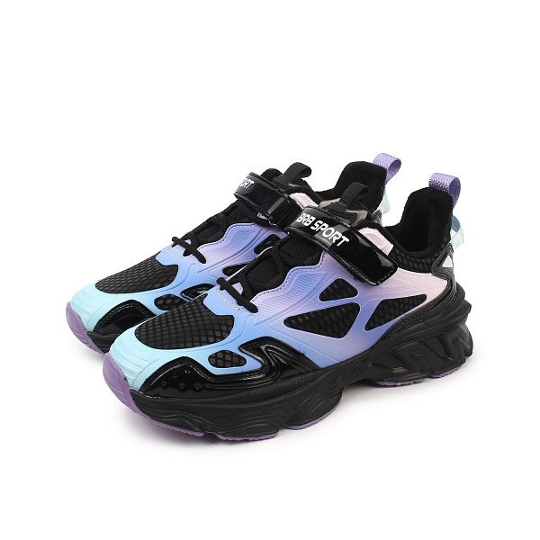 Кроссовки для девочки выполнены в ярком и необычном стиле с плавным переходом от голубого к сиреневому. Черные детали добавляют контраст и делают дизайн динамичным и современным. Обувь имеет объемную подошву с выраженным рельефом и удобную застежку-липучку, которая украшена надписью.