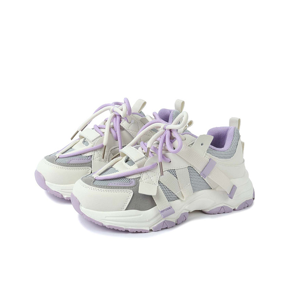 Модные полуботинки типа кроссовки для девочек школьного возраста. Основа бежевого цвета с яркими фиолетовыми и приглушенными серыми вставками. Модель объемная, на высокой подошве, с большим количеством декоративных элементов.